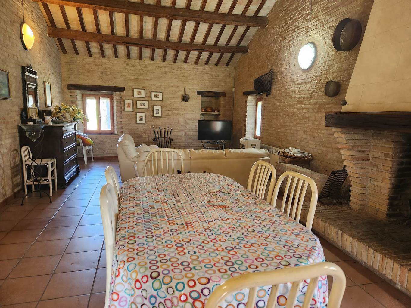 Al piano superiore troviamo un secondo soggiorno in cui l’area living offre spazio per il relax, con camino in muratura che diventa il vero fulcro della stanza. Le finestre garantiscono una buona luminosità naturale, rendendo l’ambiente arioso e piacevole durante tutto il giorno.